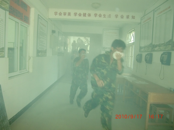 下午4时,演习在火灾警报声中拉开,公寓楼内浓烟滚滚,楼梯和走道到处都是烟雾。听到警报声后公寓楼内每个学生手拿湿毛巾,捂住口鼻,按照预定方案用湿毛巾捂住口鼻、弯腰扶墙,顺着疏散通道有序转移。3分钟后,所有学生疏散至安全区域。