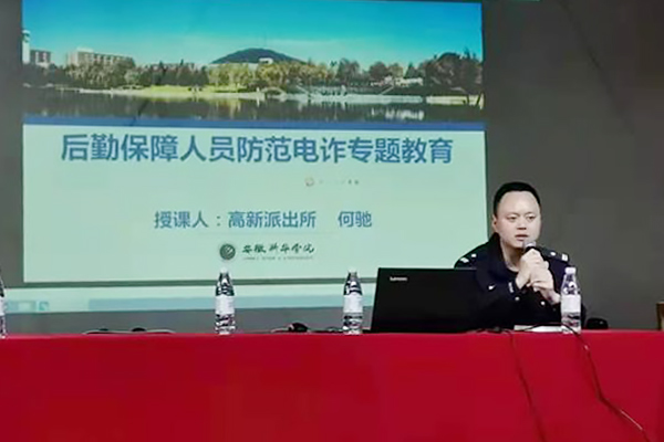 本网讯(通讯员:张炎)为全面做好校园安全工作,增强后勤服务人员的安全意识。10月26日下午,保卫处、总务处联合组织各经营单位人员、物业单位人员、宿管员、以及保安人员约300人在校大礼堂进行防范电信网络诈骗和消防安全知识专题培训,培训由高新派出所所长何驰、高新消防救援大队主任赵俊杰主讲,保卫处、总务处办公室相关人员也参加了培训。