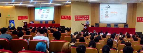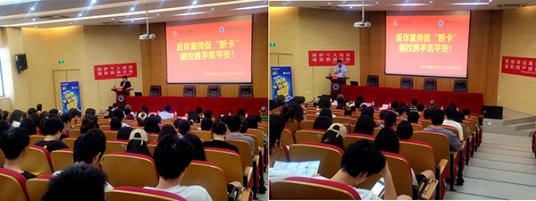 李萱警官为大家讲解了她们破获的诈骗案例以及在高校学生中常发的电诈案例类型,希望同学们引以为戒。活动现场气氛活跃,农行的工作人员还为同学们带来精美的礼品。
