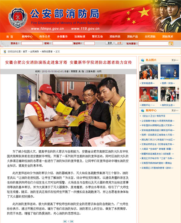 10月10日,公安部消防局网、中国消防在线、中安在线等媒体先后报道了pp电子“大学生消防志愿者服务大队”在国庆、中秋两节来临之际,开展的“消防传万家,服务你我他”、“中秋不送月饼送平安”等活动,较大地提高了pp电子消防志愿者的社会知名度。