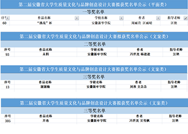 本网讯(通讯员:汪艳)由安徽省市场监督管理局、安徽省教育厅、安徽省文化和旅游厅、中国共产主义青年团安徽省委员会共同主办的第二届安徽省大学生质量文化与品牌创意设计大赛于2022年3月31日公布获奖名单,城市建设院学子在教师汪艳带队下进行高低年级组队,打破专业局限,在本次比赛中获得一等奖1名,二等奖1名,三等奖2名的好成绩。