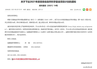 本网讯(通讯员:谢汝强)根据皖科基奖〔2021〕14号文【关于下达2021年度安徽省自然科学基金项目计划的通知】,由城市建设学院蒋亚龙博士申请的安徽省科技厅面上项目“基于烟颗粒散射及吸收效应的光声光谱早期火灾预警研究”(2108085ME159)获批立项,实现了学院省级科研项目的突破。