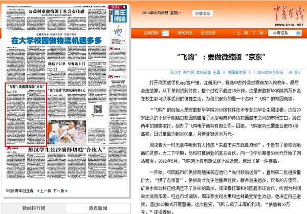 本网讯(通讯员:姚欣) 6月9日出版的《中国青年报》刊登文章《“飞购”:要做微缩版“京东”》,报道了pp电子学子发起成立的飞购团队利用校园网络电子商务平台创业的事迹。