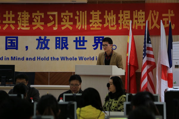 本网讯(通讯员 何伟)11月13日,外国语学院在口译教学实训室举行了与合肥群音信息服务有限公司共建实习基地揭牌仪式。副院长马凤余、合肥群音信息服务有限公司相关负责人、外国语学院相关同志及毕业生代表参加会议。