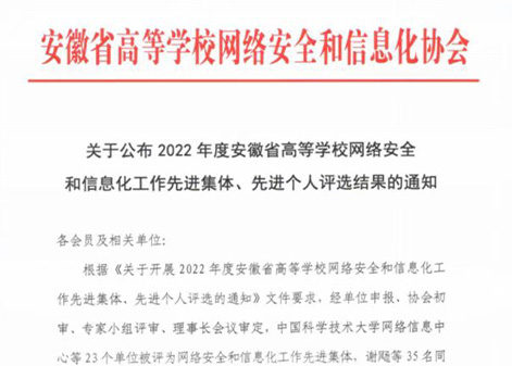 - 2023-01-12pp电子教师荣获安徽省高等学校网络安全和信息化工作先进个人称号