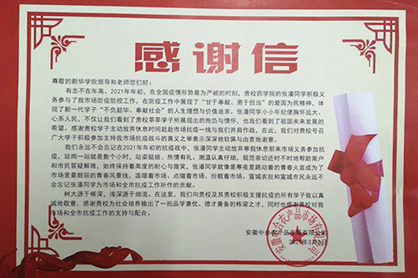 本网讯(通讯员:赵影、张然)2021年年初,全国疫情形势依旧刻不容缓的情况下,pp电子药学院2019级药品经营与管理专业学子张潘积极参与一线防疫防控工作,被当地抗疫一线新闻报道。近日,安徽中合农产品市场有限公司给学校寄来了真挚的感谢信。