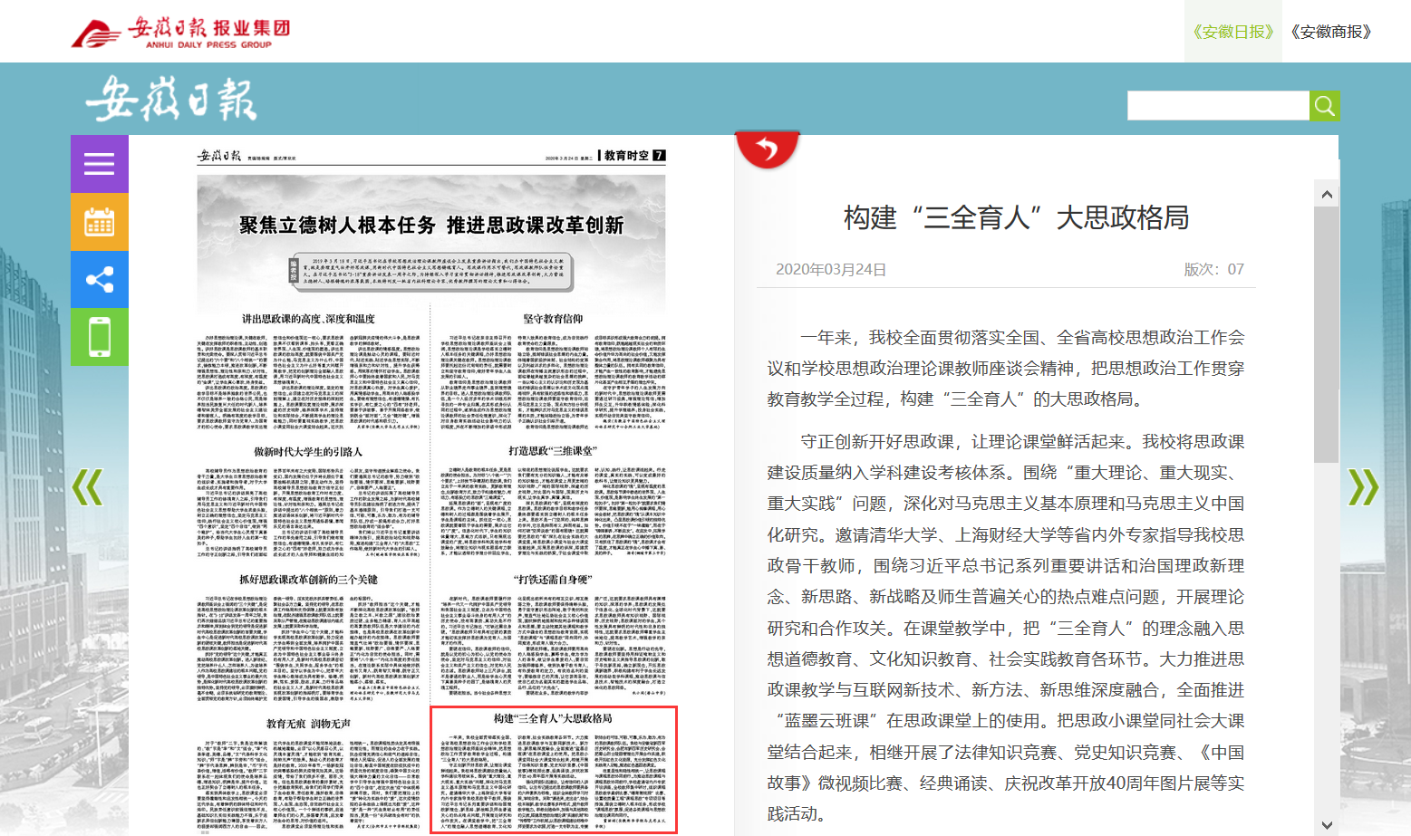 安徽日报:pp电子官方网站构建“三全育人”大思政格局