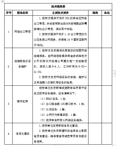1.投标方提供共计不低于30G的学生区网络出口带宽,并在使用率达到80%后根据实际需要增加出口带宽,保证用户体验;