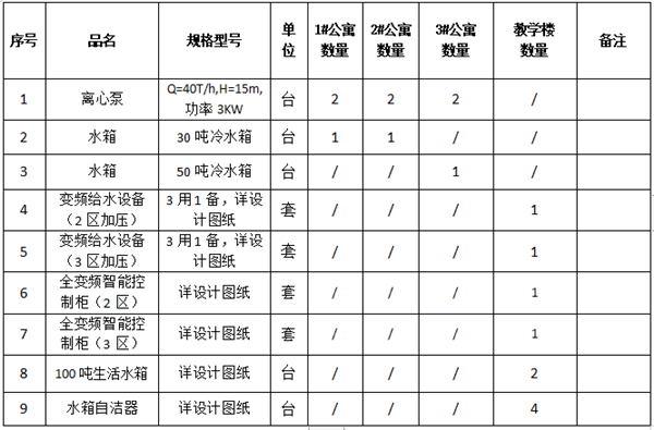 3.采购范围为:水泵、水箱、变频智能控制柜及相应辅助设备、整体设计、材料的供货,运输、卸货、安装,调试、检测验收、培训、服务等交钥匙工程。