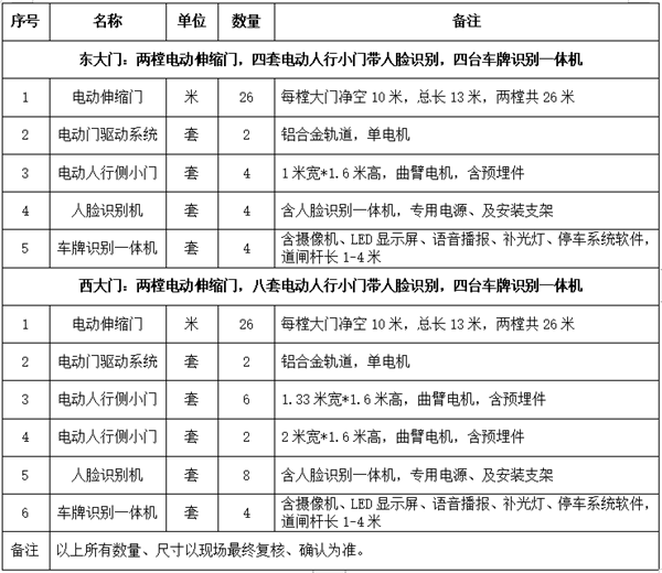 1.1 东大门电动伸缩2樘,安装车牌识别系统2进2出,共4套;