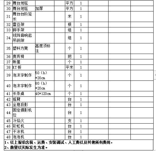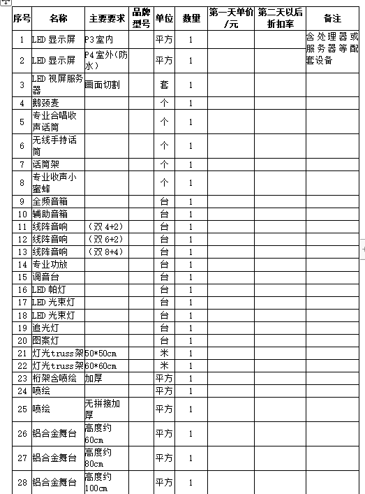 3.租赁期间报价人须安排专人负责现场活动音响、大屏等设备的安装调试工作。