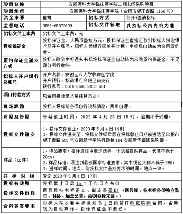 安徽医科大学临床医学院二期电缆采购项目招标公告