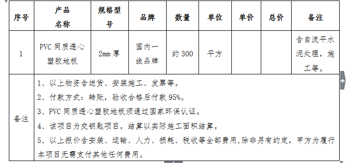 11、PVC同质透心塑胶地板须有分项报价: