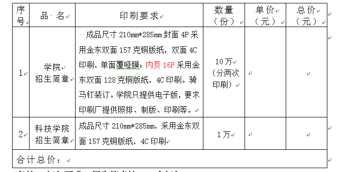 1、报价表(必须密封):报出每种规格印刷品的单价和总价及合计总价(含税、送货上门价);