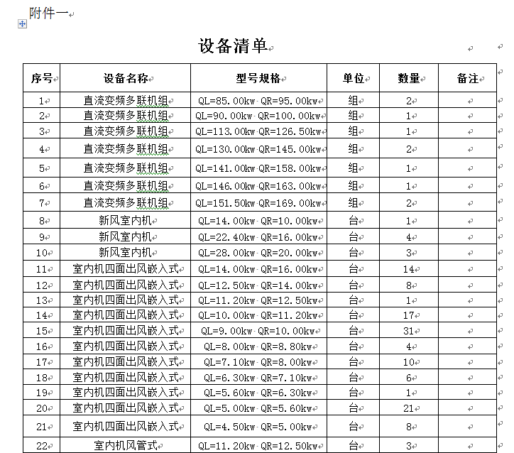 2.7.整层空调配置表及明确的施工图纸,注明每种室内机功率及外形尺寸,每种室外机的功率及外形尺寸等信息;