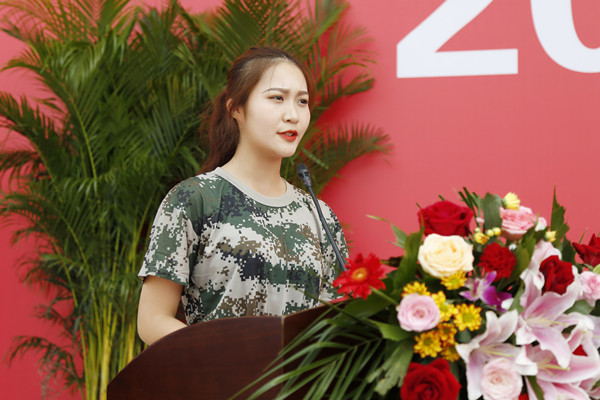 艺术学院新生代表王倩在发言中号召2019级全体新生要以高度的学习热情,扎实稳重的学习态度,乐观向上的生活心态,高昂的精神面貌,不断追求卓越,在大学这个舞台上,展示出完美的自我,展现多姿的风采。