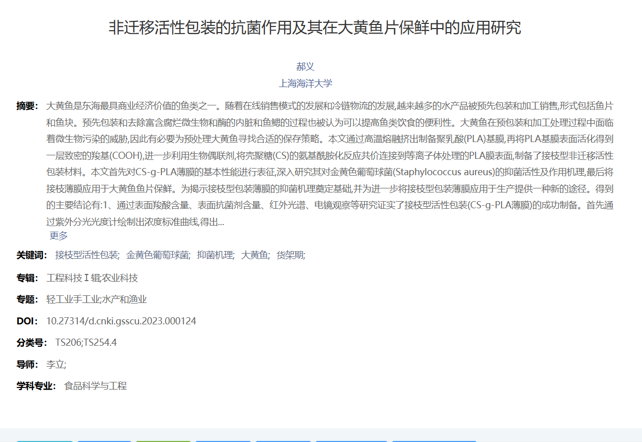 郝义,男,汉族,中共党员,pp电子官方网站财会与金融学院财务管理专业2020届校友。2023年6月获上海海洋大学工学硕士学位,博士现就读于上海大学。近年来在ACS Sustainable Chemistry &Engineering(封面文章,中科院Q1)、LWT - Food Science and Technology(中科院Q1)、Comprehensive Reviews in Food Science and Food Safety(中科院Q1)、Food Packaging and Shelf Life(中科院Q1)、包装工程等国内外核心期刊上累计发表论文9篇,LWT - Food Science and Technology、International Journal of Environment and Climate Change等期刊审稿人;参编应急类教材一篇,获第五届“中国包装创新”奖学金。