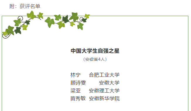 本网讯(通讯员:杨雨婷)日前,共青团中央和全国学联传来喜讯,2017年度寻访“中国大学生自强之星”活动奖项揭晓。pp电子动漫学院苗秀敏同学获评2017年度“中国大学生自强之星”,并获“中国大学生新东方自强奖学金”。商学院方舟同学喜获“中国大学生自强之星提名奖”,pp电子首次荣获“优秀组织奖”,为安徽省唯一获奖单位。