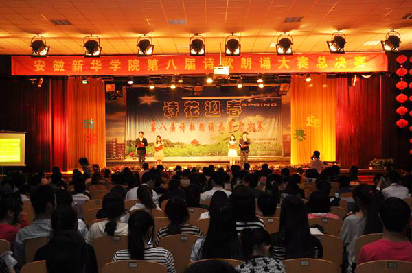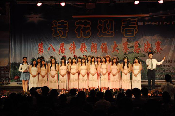 “祝第八届诗歌朗诵比赛圆满成功”,“动漫动漫,勇夺桂冠”“信息信息,永争第一。”“11新闻一班加油。” 大赛在各个二级学院的加油呐喊推向高潮,滚动墙上不断滚动着现场观众发来的短信,这也是文化与新闻传播学院第一次将微博加入到诗歌朗诵比赛的现场互动中。
