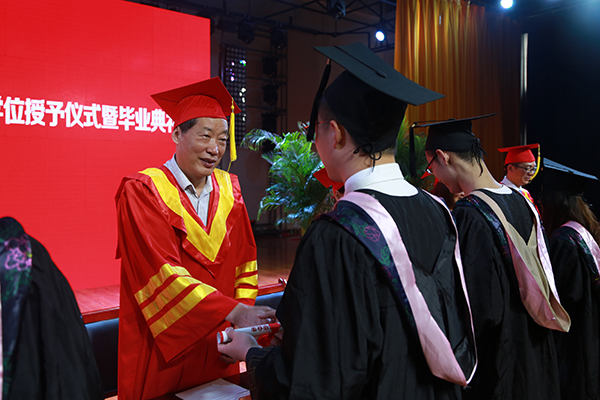 集团、学校领导为毕业生代表颁发学士学位证书、扶正流苏,祝贺他们顺利完成大学四年的学业。