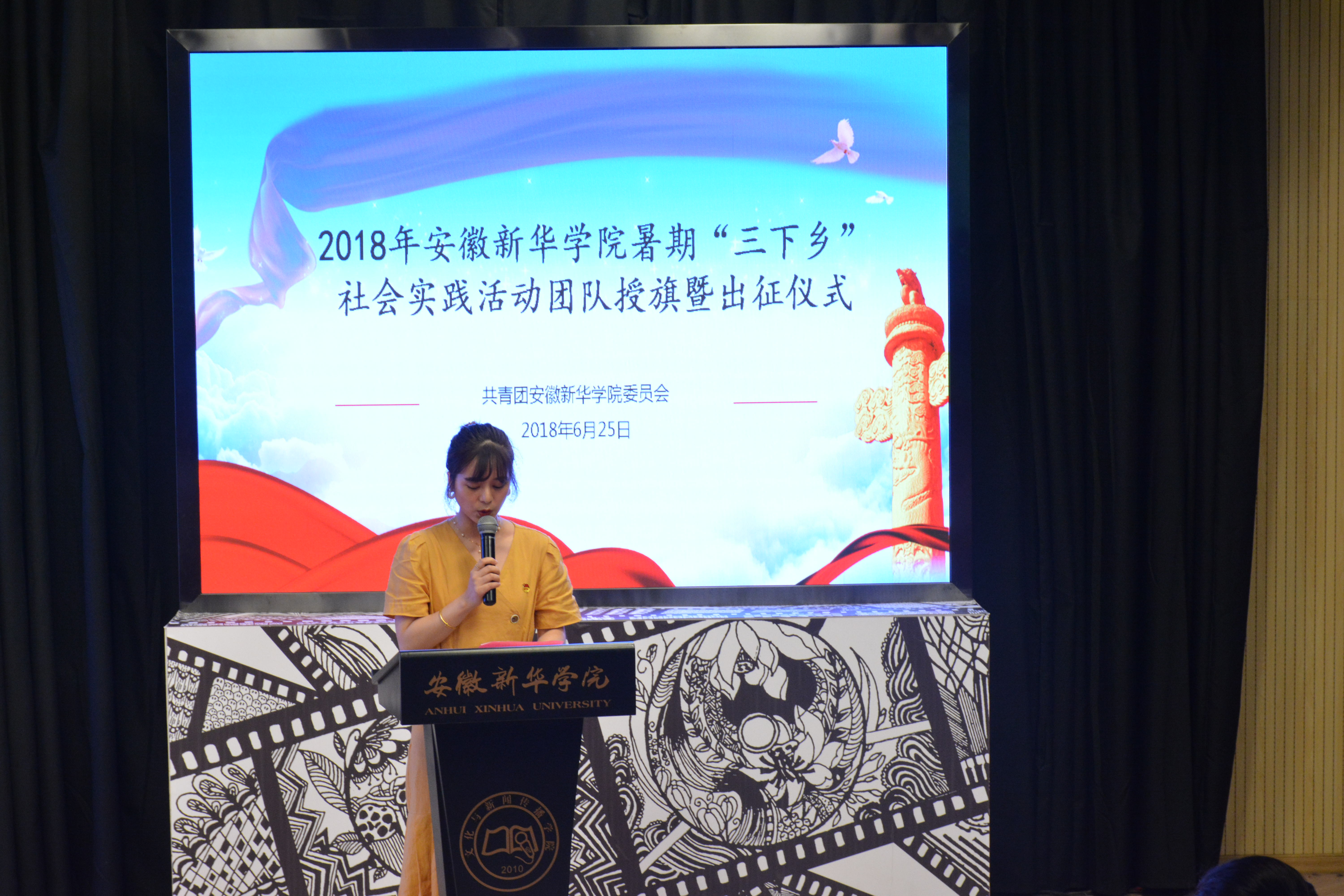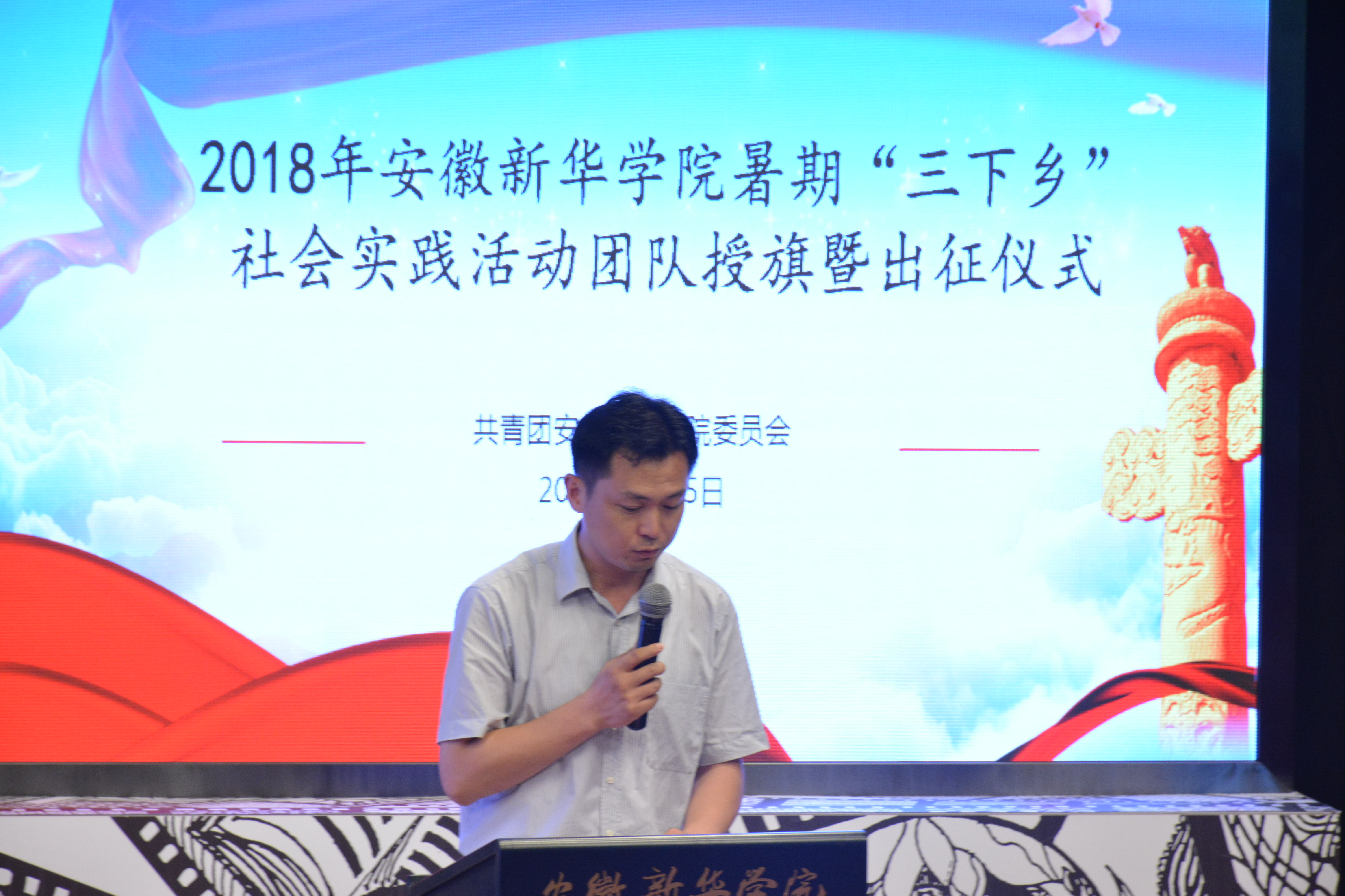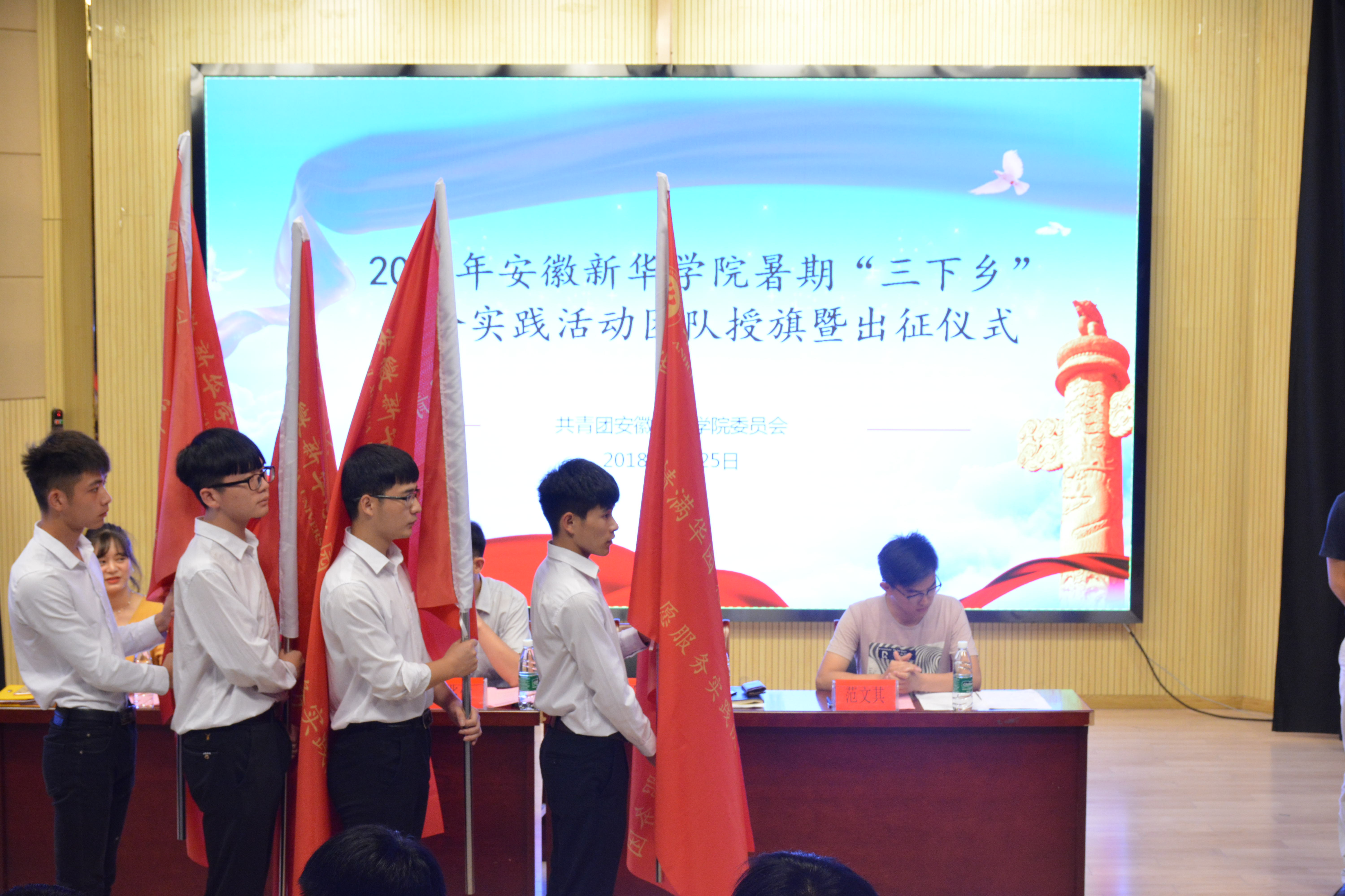 本网讯(通讯员:杨雨婷)为更好地深入贯彻习近平新时代中国特色社会主义思想,引领教育广大青年学生勇做担当民族复兴大任的新时代生力军,培育自觉为人民服务的责任意识,以实际行动助力精准扶贫乡村振兴战略,切实感受改革开放40年取得的新成就新面貌,恰逢中国共产主义青年团第十八次全国代表大会即将召开的重要时期,pp电子于6月25日上午10时在文传演播厅举办2018年文化科技卫生暑期社会实践活动(以下简称“三下乡”)授旗暨出征仪式,紧跟党、紧跟习近平总书记,意气风发迈上新征程。出席本次会议的有校党委委员、副校长朱兆健,党委学工部部长、学生处长汪俊东,校团委副书记柯姗姗,党委宣传部、宣传处处长助理范文其以及各二级学院副院长、团总支书记。本次会议由柯姗姗主持。