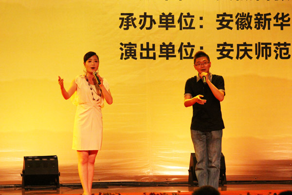 校团委洪威老师与优秀青年黄梅戏演员彭秀荷联手演唱的《海滩别》情深意切,两人配合十分默契。