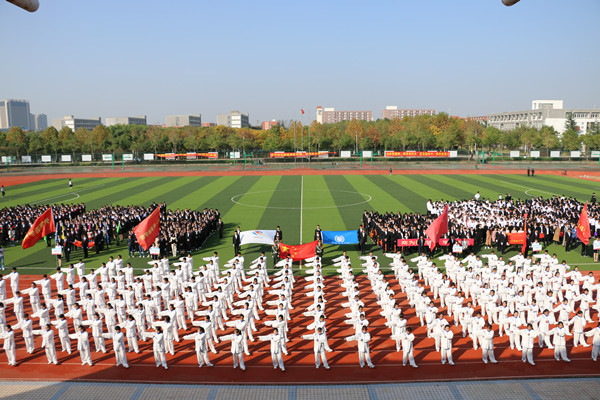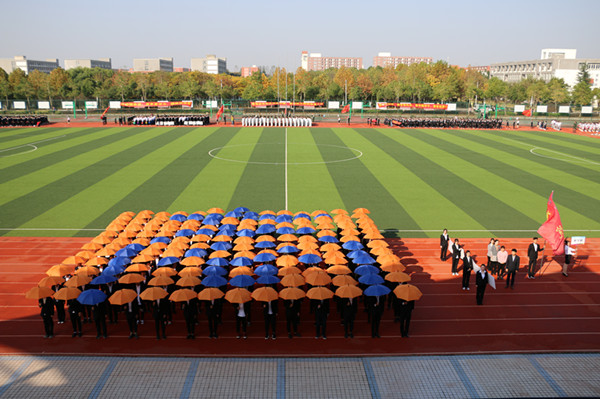 首先入场的是商学院队伍,他们迈着整齐划一的步伐,喊着“商为国计,学为民生”的口号迎面走来,空中俯瞰,蓝、橙色伞组成的“商”字鲜艳夺目;电子通信工程学院方阵通过挥舞旗帜,变换显示着“电子NO.1”字样,学生自制的飞行器编队盘旋飞行在主席台上空,体现了pp电子学子的实践能力和创新水平;土木与环境工程学院学子手举标尺、模型、工具箱,以豪迈的气势印证着他们的必胜信念……财会与金融学院、文化与新闻传播学院、外国语学院、信息工程学院、药学院、艺术学院、国际教育学院、科技学院也分别以极具特色的方阵展示着各学院特色和学子们昂扬的青春姿态。
