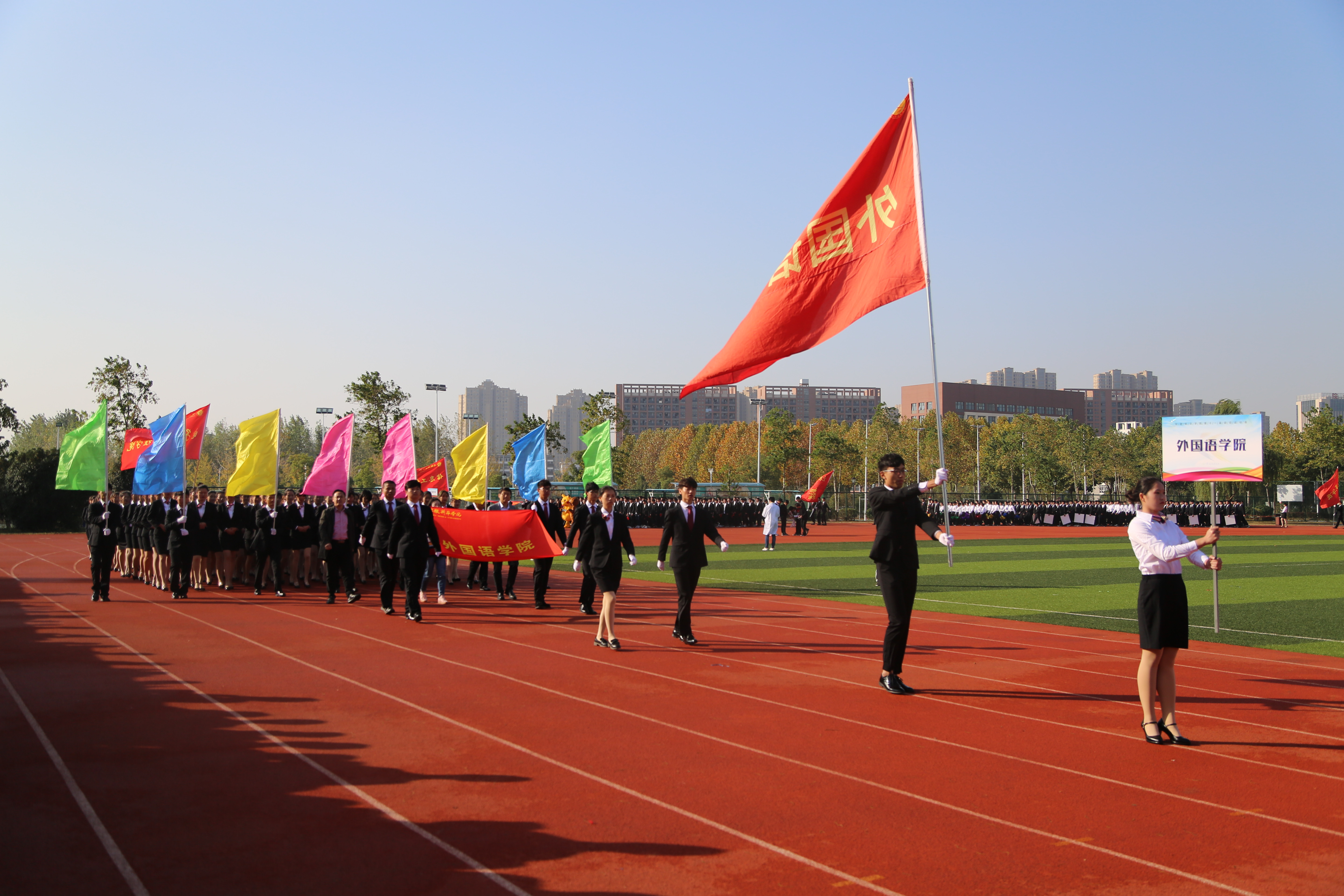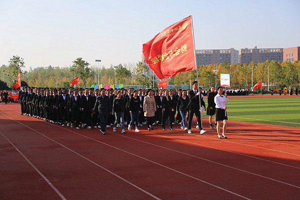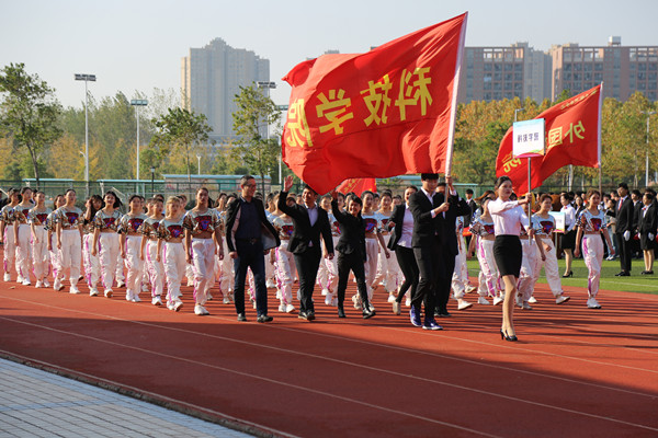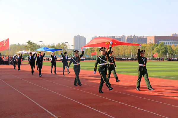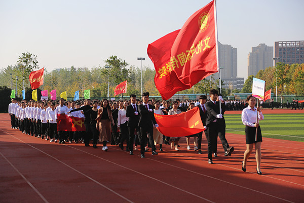 伴随着欢快昂扬的运动员进行曲,护旗手高举国旗、校旗和本届运动会会旗,精神抖擞地走过主席台。各二级学院代表团紧随其后,迈着强健有力的步伐,依次入场。