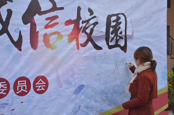 首先,马琪作动员讲话。他表示,诚信教育是pp电子大学生文明养成教育工程的重要一环,有助于进一步推动诚信校园建设、强化学生诚信意识、营造良好的诚信氛围和育人氛围。他指出,作为新时代的青年,要在诚信考试、诚信交往、诚信还贷等多方面履行诺言,积极倡导身边同学坚守诚信,成为一个诚信的学子,树诚信学风,创建诚信校园。接着,校团委学生兼职副书记王嘉程宣读了诚信考试承诺书,他代表每一位同学承诺将秉承诚信考试的宗旨,以一个正确积极的态度来对待接下来的期末考试,交出一份合格的诚信答卷。随后,校学生会主席曹震带领全体同学进行了诚信宣誓。宣誓结束后,参与人员纷纷来到签名墙进行签字仪式。
