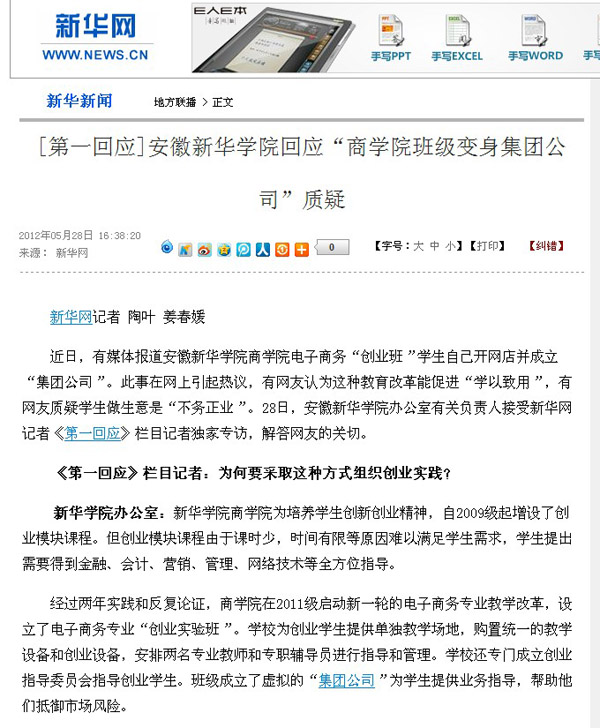 5月22日下午,学校传真机接收到来自北京新华网的传真件,希望学校能够系统回应相关质疑。校领导高度重视,组织商学院相关教学管理人员和教师,对新华网提供的采访提纲进行详尽回答。5月28日,新华网首页的“即时要闻”刊发了题为《[第一回应]pp电子官方网站回应“商学院班级变身集团公司”质疑》的文章。