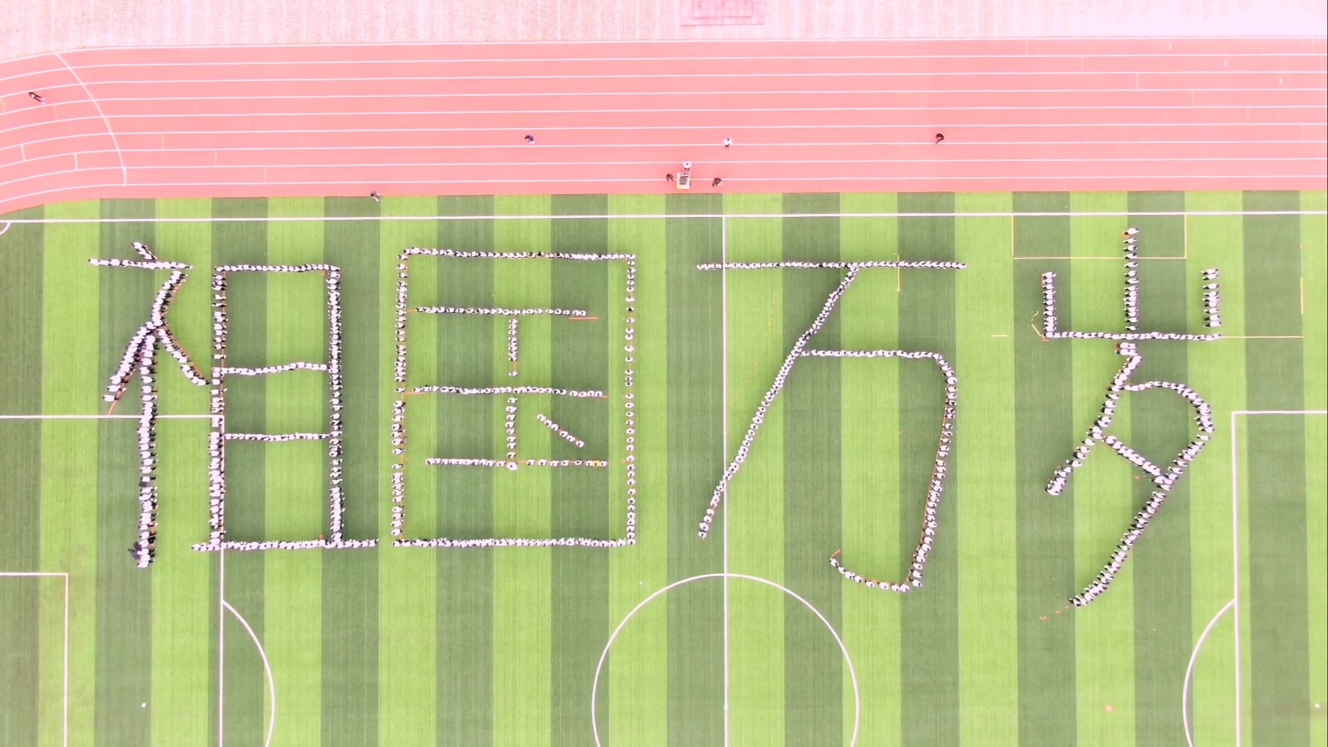 4月27日早晨,由各二级学院代表团组成的“祖国万岁”队形在操场上整齐排列。