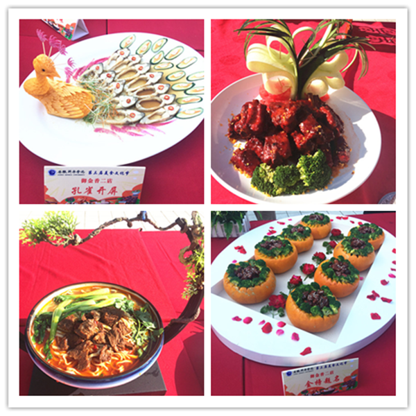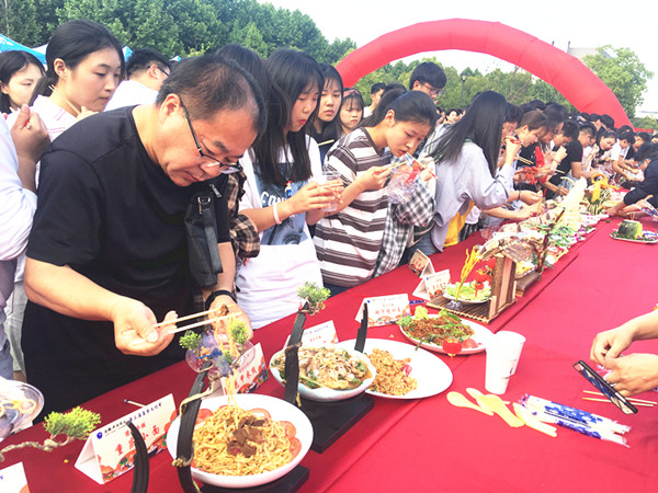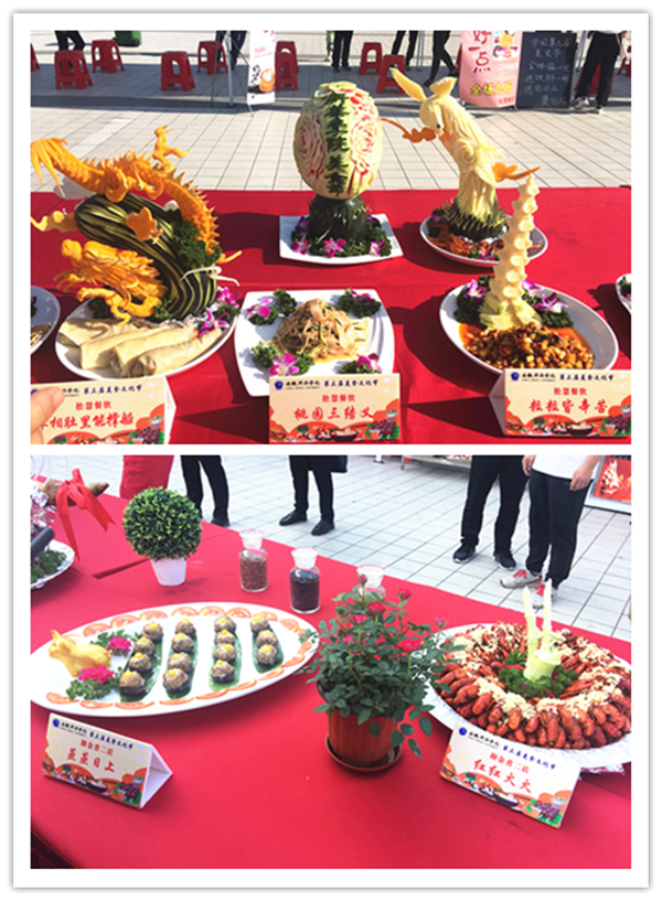 美食节现场分为主题蛋糕区、雕刻观赏区、菜品品鉴区与特色小吃区。 “书香门第、宰相肚子能撑船、金榜题名”……这些新颖的菜名听起来就很有文学范儿;还有“龙门飞甲、脆椒霸王肘、桃园三结义、狮王争霸、沙场点将”……无论从色泽还是口感上都似乎让师生在陶醉于美味的同时感受到了些许侠士豪情。整个展区鲜香诱人、美味荟萃、各类美食琳琅满目,偌大的展台配以各色美食,足以让人还没来得及品尝便已垂涎欲滴。本次参展美食品类涉及蒸、煮、煎、炸、烤、烫等各类工艺制作的特色菜肴近两百种。为保证评选环节的公平公正,总务处还专门邀请了来自校内不同院系的领导、教师、学生代表参与现场品鉴,并邀请部分领导和教师代表担任评委打分。