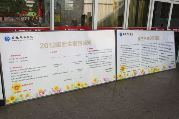 学校在各个人流较多和醒目的地方都安置了新生报到流程图和入学须知