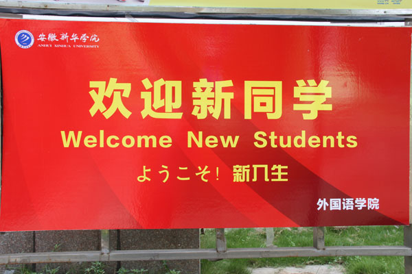 外国语学院的迎新主体展板使用了中、英、日三种语言