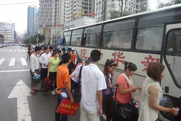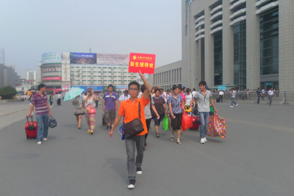 五点半起床,六点钟到图书馆门前集合,等六点二十第一班从学校开往火车站的校车,去开始新一天的迎新工作。青年志愿者协会的刘修宇和他的队友们在车上的时候还有点困,一路迷迷糊糊的睡到了火车站。到达车站后,拍拍脸,已然精神抖擞。今天的工作是在火车出站口举着牌子接新生,将新生及其家长引到指定的地点等候校车。