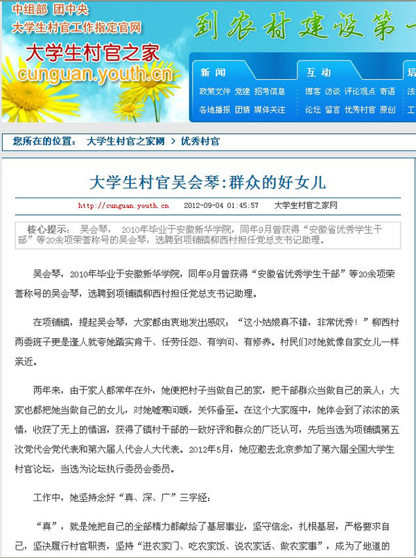 大学生村官之家网站报道pp电子优秀毕业生村官事迹