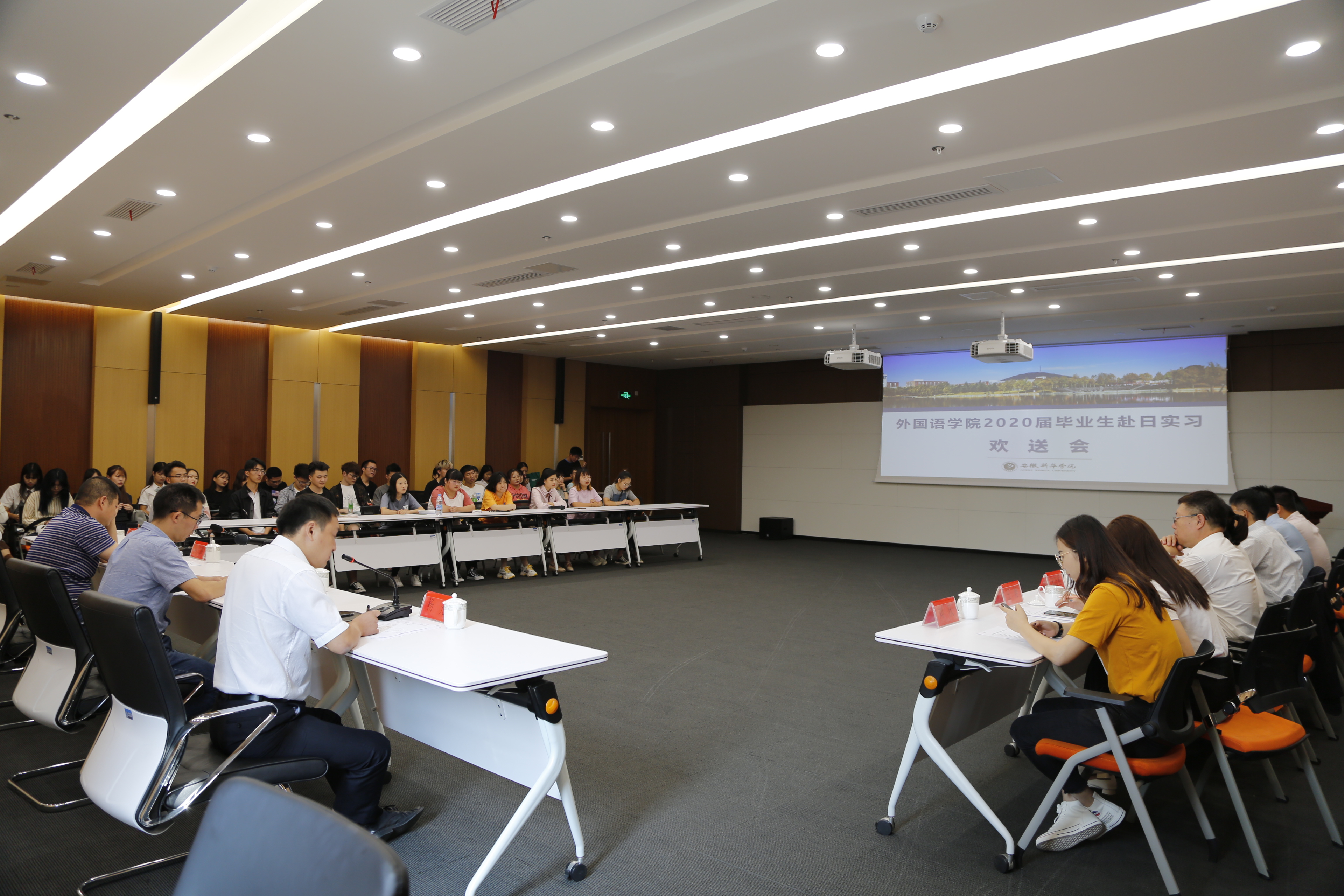 本网讯(通讯员:王婷)为做好pp电子外国语学院2020届毕业生实习工作,9月29日上午,在科研楼一楼多媒体室召开外国语学院2020届毕业生赴日实习欢送会。副校长方纯洁、陈义盛、外国语学院院长张杰、副院长杨光,国际经济事业合作組合代表理事新保则人(日)、江苏中澜境外就业服务有限公司高校部经理李文城、江苏中澜境外就业服务有限公司杨鑫兴以及外国语学院相关专业的师生代表参加了此次欢送会,会议由杨光主持。