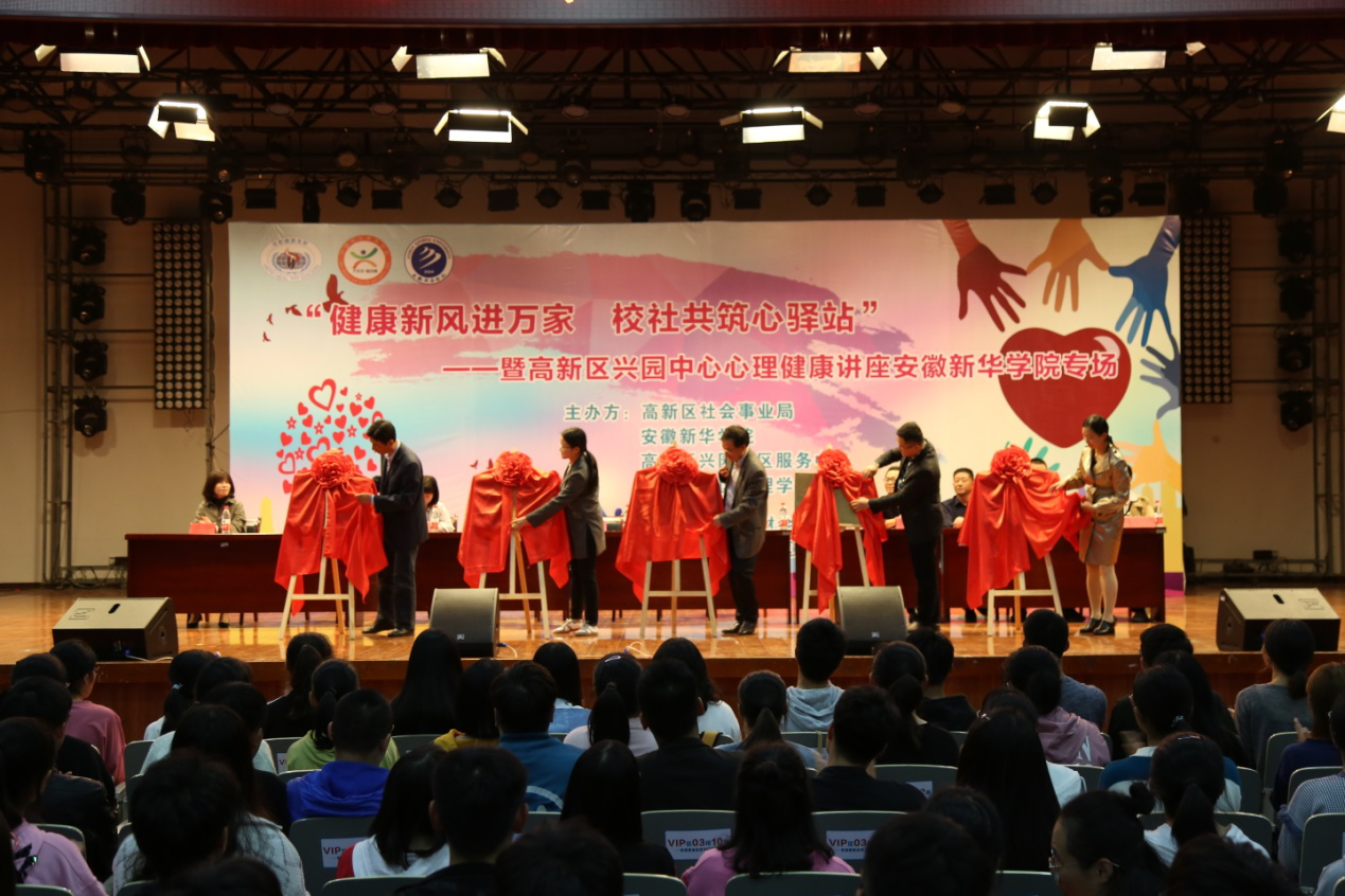 本网讯(通讯员:范文其)10月11日,“健康新风进万家 校社共筑心驿站”高新区兴园中心心理健康讲座pp电子官方网站专场活动暨高新区社会事业局、高新区兴园中心、高新区心理学会、pp电子官方网站“心灵驿站”合作共建基地、大学生社会实践基地揭牌仪式在pp电子大礼堂举行。合肥市卫生健康委员会副主任陈学超、pp电子官方网站校长助理贺行佳以及高新区社会事业局、高新区兴园中心、高新区心理学会相关领导出席仪式。安徽日报、合肥日报等媒体朋友以及pp电子800余名师生参加了仪式。