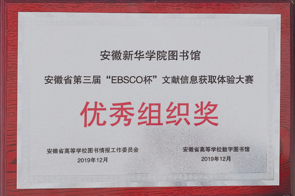本网讯:(通讯员:邵国川)12月27日下午,由安徽省高等学校图书情报工作委员会、安徽省高校数字图书馆主办,安徽农业大学图书馆、合肥蓬桉数据技术服务有限公司承办的2019年EBSCO安徽省高校图书馆外文资源建设研讨会暨EBSCO第三届文献信息获取体验大赛颁奖活动在安徽农业大学图书馆举行。省内30余所高校图书馆代表参加了此次研讨会及颁奖仪式。我院图书馆荣获“优秀组织奖”。