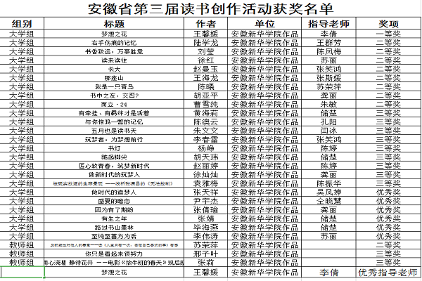 本网讯(通讯员:王青叶)近日,安徽省校园读书创作活动组织委员会公布了安徽省第三届校园读书创作活动获奖名单。我院在本次活动中再创佳绩,27名师生在此次读书活动中获奖,其中一等奖1人,二等奖9人,三等奖11人,优秀奖6人,优秀指导教师1人。获奖人数创历史新高。获奖名单如下: