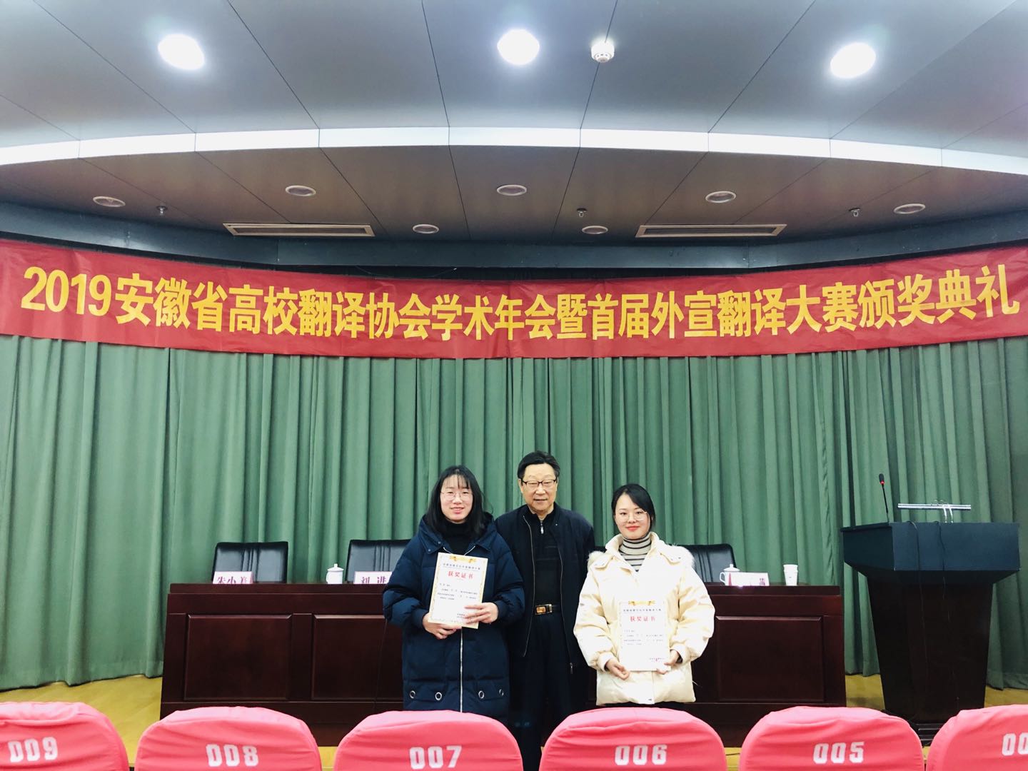 12月27日下午,安徽省首届外宣翻译大赛颁奖典礼暨2019安徽高校翻译协会年会在安徽大学龙河路校区召开。来自安徽省商务厅、安徽省外办、安徽省贸促会、合肥市外办、宣城市外办、六安市外办、池州市外办、芜湖市翻译协会以及中国科学技术大学、合肥工业大学、安徽大学、安徽农业大学、合肥学院等在肥高等院校教师代表、获奖选手代表以及翻译协会会员和高校翻译专业研究生等100余人参加了会议,外国语学院赵素素同学应邀参加典礼,并领取了获奖证书。