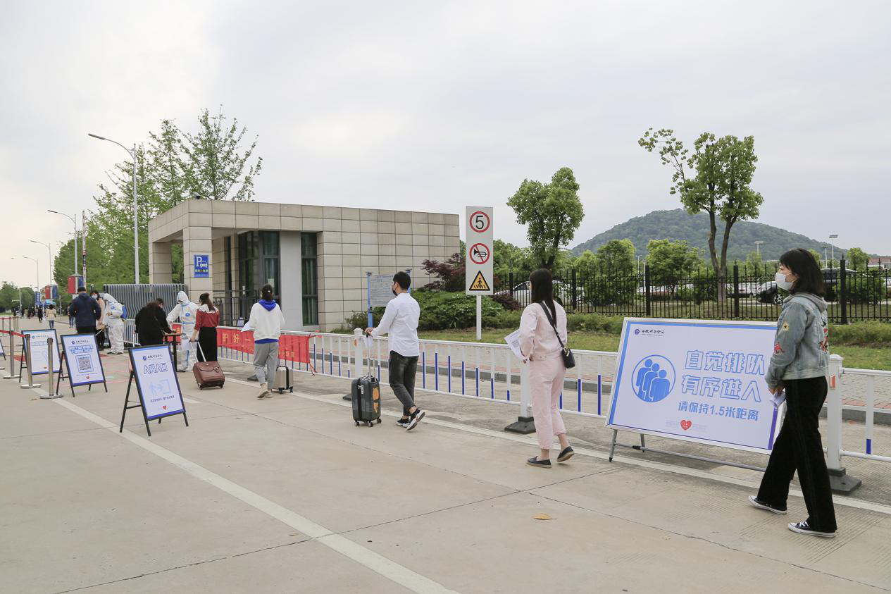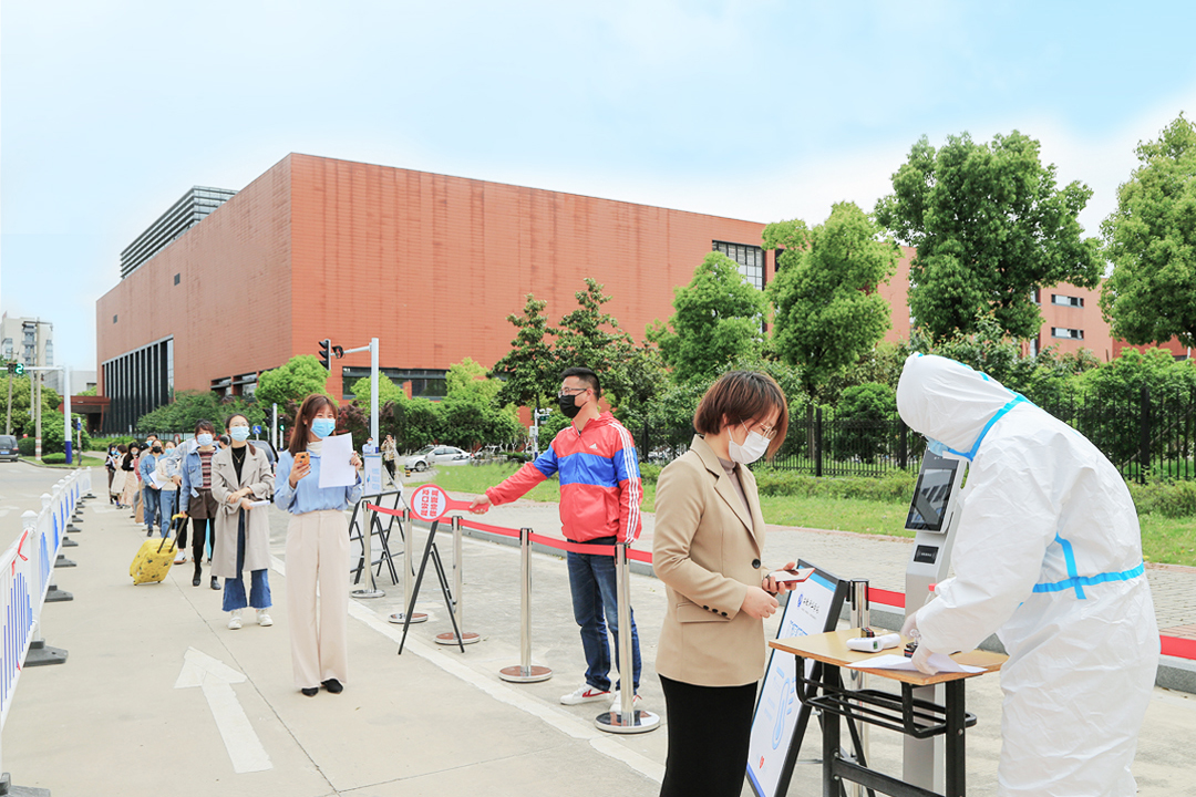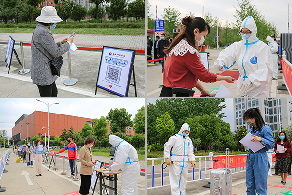 在学生返校报到场景演练中,设立入校通道、身份核验点、测温点、行李消杀点、应急处置点,返校人员手持健康承诺书,保持安全距离,扫描健康码进行身份审核,在工作人员的引导下分别进行体温检测、行李消杀、定点报到,重点模拟演练了发热学生的应急处置。