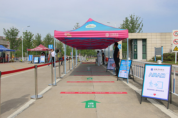 上午7:30左右,陆续有同学拖着行李箱到达报到东门报到点。在现场工作人员的引导下,同学们间隔1.5米,排队有序通过测温通道。