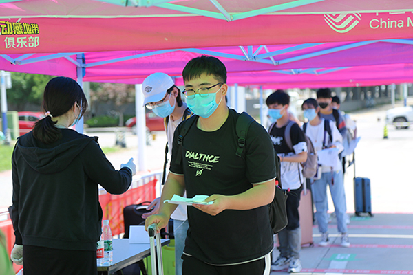 同学们通过扫描“安康码”、测量体温、核验身份、查验安康码,在洗手消毒、行李消毒之后,在学院报到处完成入校报到手续,并领取返校“爱心防疫包”。