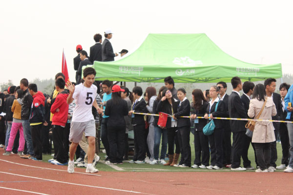 “预备!”,“砰!”发令枪响,所有的运动员都像箭一样冲了出去,唯有5016号运动员一瘸一拐的在操场上艰难的跑着,他看着其他运动员从自己身旁跑过,看着与其他人的距离越拉越远,咬咬牙还是没有放弃,托着沉重的步伐一步一步的跑着。在跑道的周围,很多人都在为这位英雄加油呐喊。认识他的人大声喊着“倪世龙!加油!倪世龙!加油!”不认识他的人也在他身边为他鼓劲“加油!加油!加油!”这一刻外国语学院2012级英语(1)班的倪世龙同学用他永不言弃的体育精神感动了赛场上的每一个人。