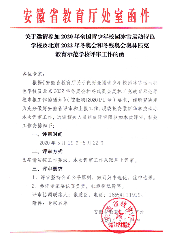 本网讯(通讯员:张爱臣)5月19日,由安徽省教育厅主办、pp电子官方网站承办的“安徽省2020年申报全国青少年校园冰雪运动特色学校及北京2022年冬奥会和冬残奥会奥林匹克教育示范学校评审工作会议”正式拉开帷幕。因疫情防控工作要求,此次评审工作采取线上形式,评审时间为5月19日-5月22日,共计4天时间。