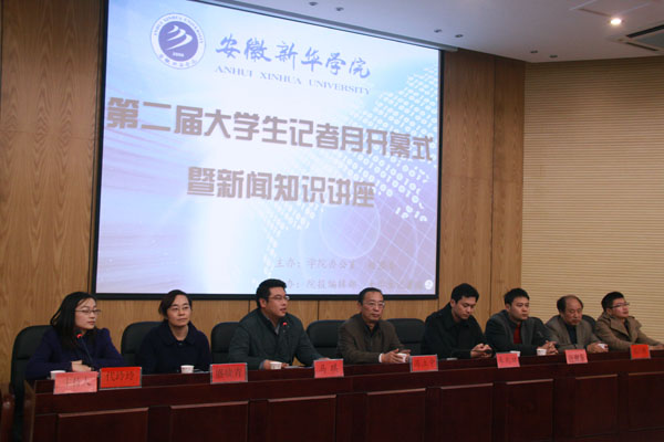 本网讯(学生记者:陶文、孙菲菲)为纪念第13个中国记者节,11月13日中午,由办公室和校团委共同举办、大学生记者团承办的第二届记者活动月开幕仪式在学术报告厅举行。《中国健康报》安徽记者站站长、安徽卫生厅新闻办主任、主任记者冯立中,学生处处长、校团委书记朱兆健,办公室副主任马琪、盛晓青,学生处副处长汪俊东、《新华学院报》主编张昌顺副教授及百余名师生齐聚一堂,共同探讨校园记者的成章之径。开幕式上,冯立中为在场学子奉献了一场精彩的新闻知识讲座。