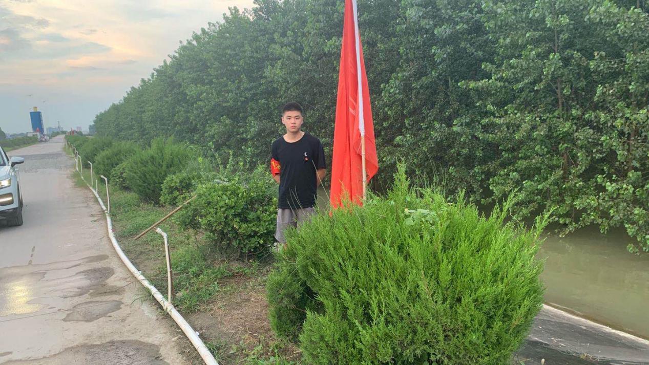 正值汛期,合肥市长丰县的孔圩村滛河孔圩段水位线暴涨,华园青年实践队员杨泰一积极响应,主动联系,迅速投身到家乡的抗洪救灾工作中。作为一名大学生,一名共青团团员,他不怕苦、不怕累,冒着大雨、顶着烈日,坚守在防汛抗洪一线,对存在安全隐患的堤口进行巡查,昼夜巡堤、查险排险。“洪水当前,我能做的并不多,我是村里的年轻人,就要守土有责,守护好堤坝,保护好家乡,就是我现在最大的担当。”面对洪水,杨泰一选择坚守责任,扛起担当。