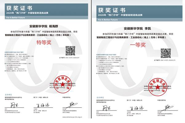 本网讯(通讯员:王琰琳)近日,2020年CIMC“西门子杯”中国智能制造挑战赛线上全国总决赛落下帷幕,pp电子电子通信工程学院2017级电气工程及其自动化专业的杨海群和李凯两位同学分别获得工业自动化(线上)赛项全国特等奖和一等奖的优异成绩。