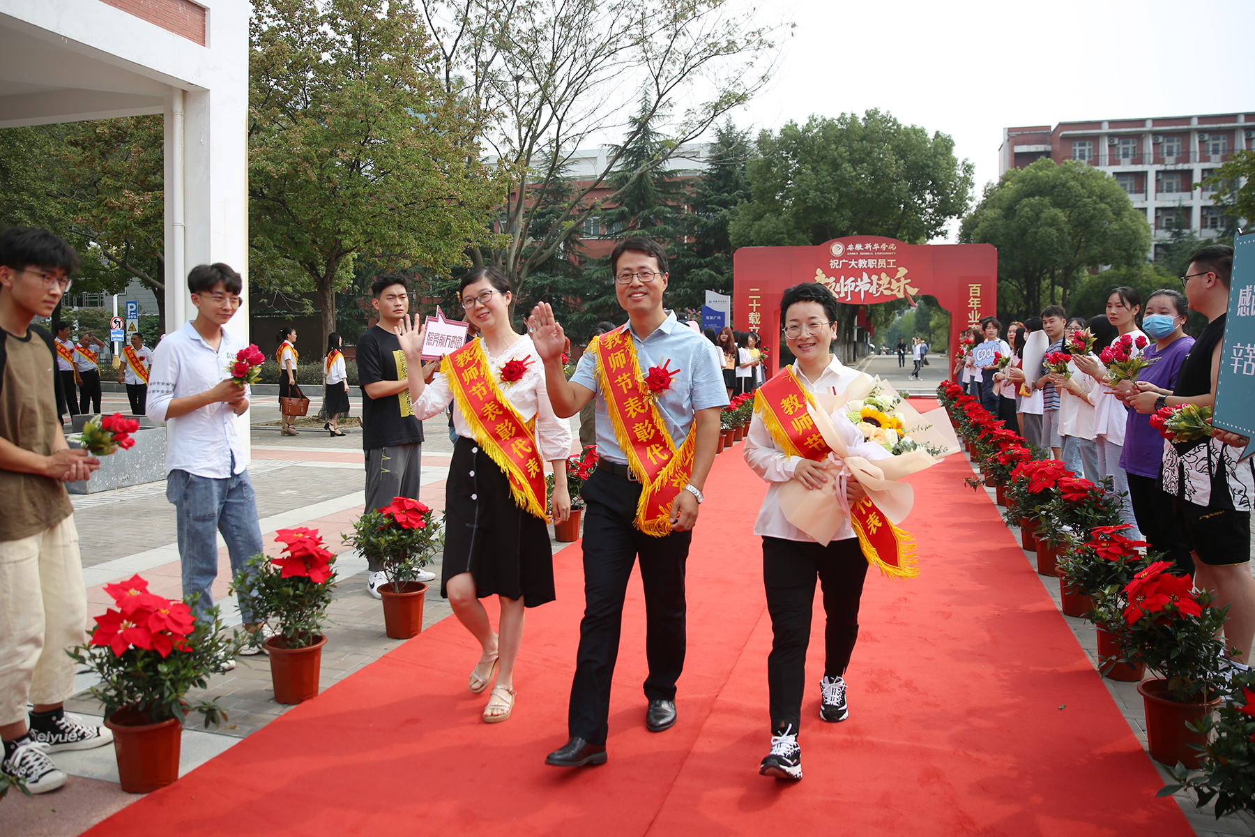 在蜀麓广场,红毯“走秀”拉开了表彰大会的序幕,老师们迈着自信、从容的步伐,在掌声和欢呼声中走过红毯。下午3时,表彰大会正式开始,校长石秀和宣读教师节贺信,向广大教职员工致以节日的祝贺和亲切的慰问。贺信中提到:“教师是教育事业的追梦人,pp电子每位教师都是怀揣着对教育工作的热爱加入到这个大家庭,专心执教、潜心育人,在学校发展的每一步都镌刻了永恒的记忆!经过全体教职员工的共同努力,新华集团办学实力显著增强,已经形成了以高等教育为龙头,职业教育、基础教育、教育培训齐头并进的良好局面,各教育单位在校园建设、学科专业优化、师资队伍建设以及人才培养模式创新等方面均取得了优异成绩,受到学生与家长的信赖,受到各级党委、政府的褒奖。”
